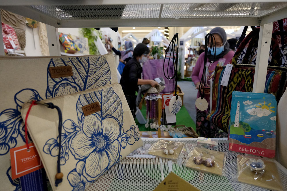 Pengunjung melihat produk kerajinan pernak pernik di stan UMKM pada pameran In Store Promotion Kementerian Perdagangan di Atrium Mal Kota Kasablanka, Jakarta, Rabu, 18 November 2020. Foto: Ismail Pohan/TrenAsia