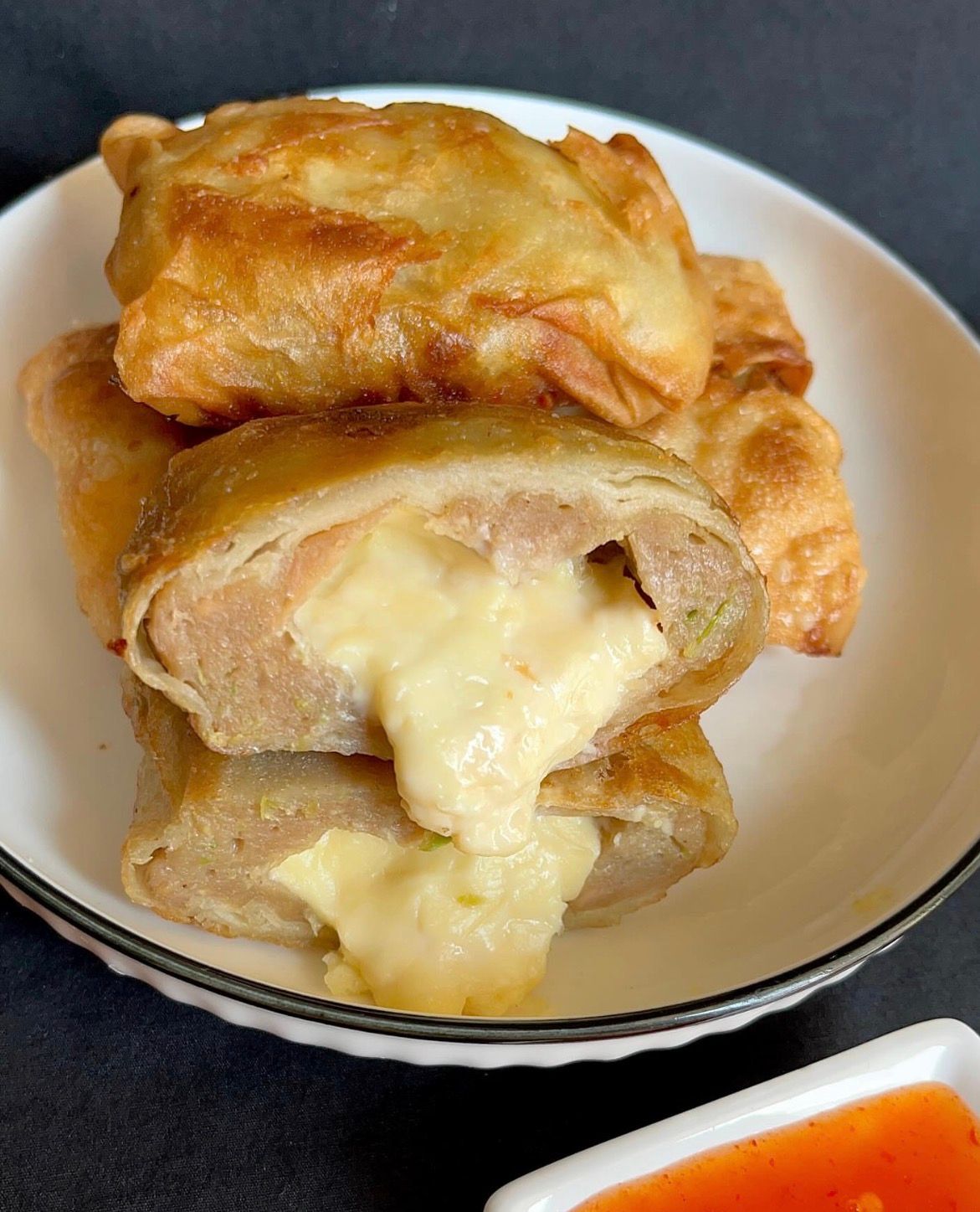Dimsum goreng keju lumer merupakan camilan kekinian yang memadukan pangsit ala China yaitu dimsum dengan isian keju leleh di dalamnya.